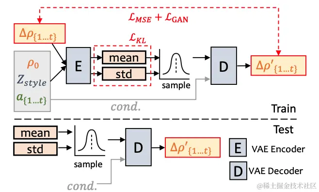 类似于条件变分自编码器(CVAE),PoseVAE在模型中还引入了相应的音频特征和风格标识,用作节奏感知和身份风格的条件。模型使用KL散度来度量生成运动的分布,同时采用均方损失和对抗性损失来确保生成的质量。这样的设计综合考虑了多个因素,提高了生成视频的运动真实性和质量。