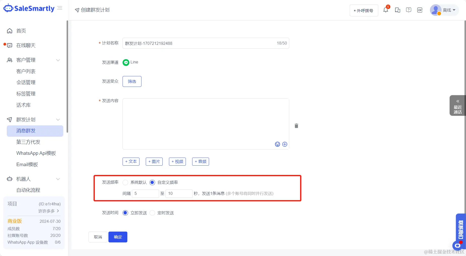 除了其他人举报你的聊天内容之外,LINE官方也肯定有相关的筛选机制。如果你在短时间内发送大量相同的消息,LINE官方很有可能会封锁你的账号(包括手机和号码),你将永远无法再使用LINE。所以在LINE群发时需要特别注意,要使用可以设置群发频率的群发软件SaleSmartly,设置发送每条消息后需要休息几秒钟并在发送数十条消息后等待更长的时间。