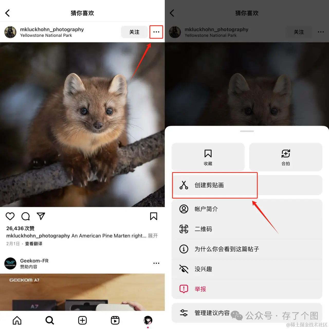 点击想要建立剪贴画的贴文右上角“三个点”图标,然后点击“创建剪贴画”