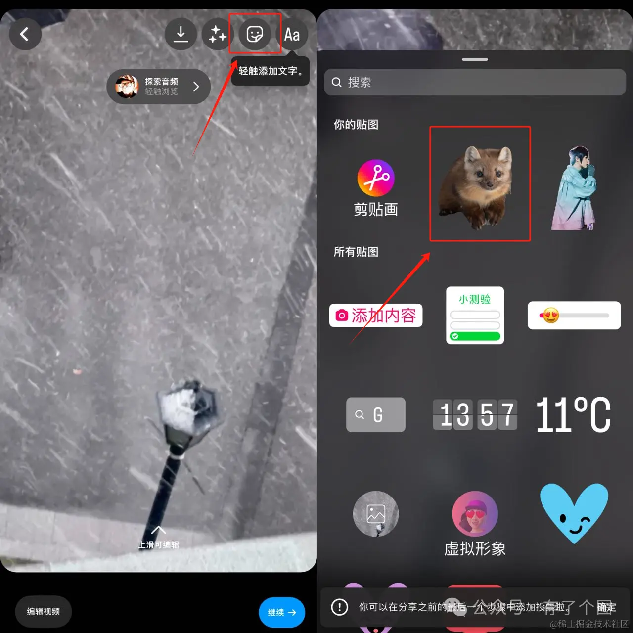 然后我们按照正常步骤发表IG限时动态,点击右上角的“贴图”图标后就能看到新生成的“剪贴画”了