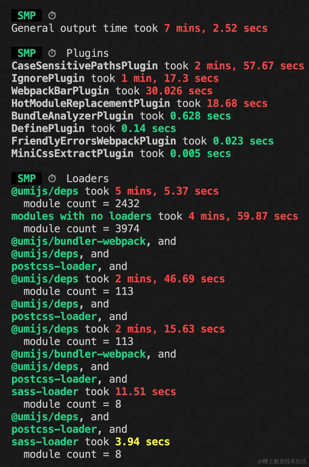 一般webpack项目构建结束会有Compiled successfully in 耗时提示,如果想看具体在哪些环节耗时长,可以在script设置SPEED_MEASURE=CONSOLE(UMI文档)。对应webpack配置speed-measure-webpack-plugin插件。