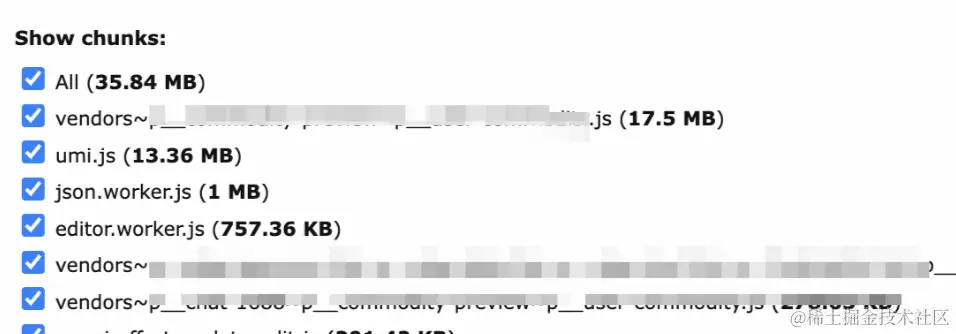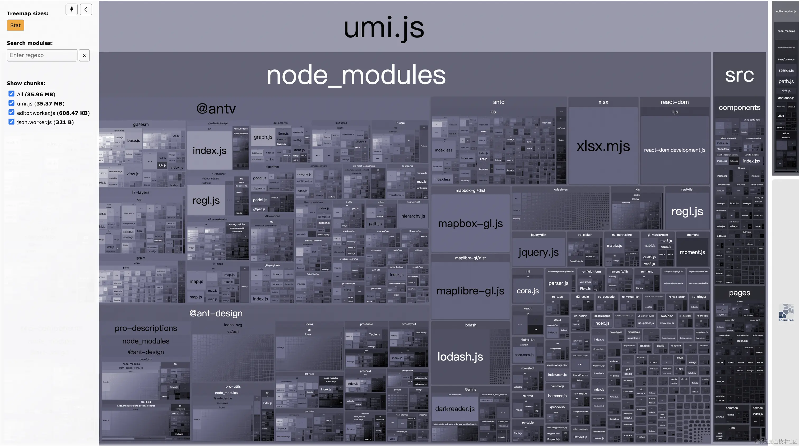 配置后,:8888端口会展示构建结果体积分布报告。这里能看出umi.js包构成,需要做一些处理: