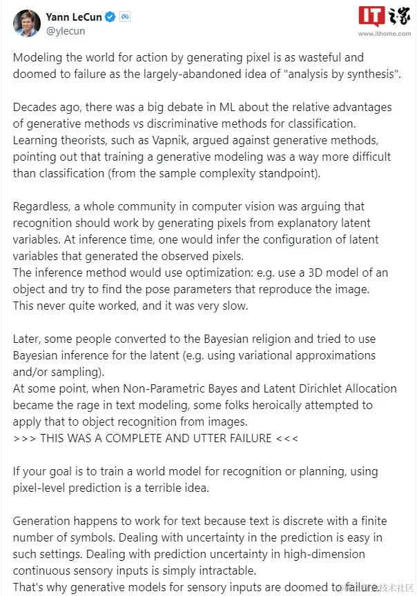LeCun 在 X 平台(原 Twitter)发帖称:“通过生成像素来模拟世界的行为,就像曾经被广泛弃用的‘通过合成进行分析’一样,既浪费资源又注定失败。”