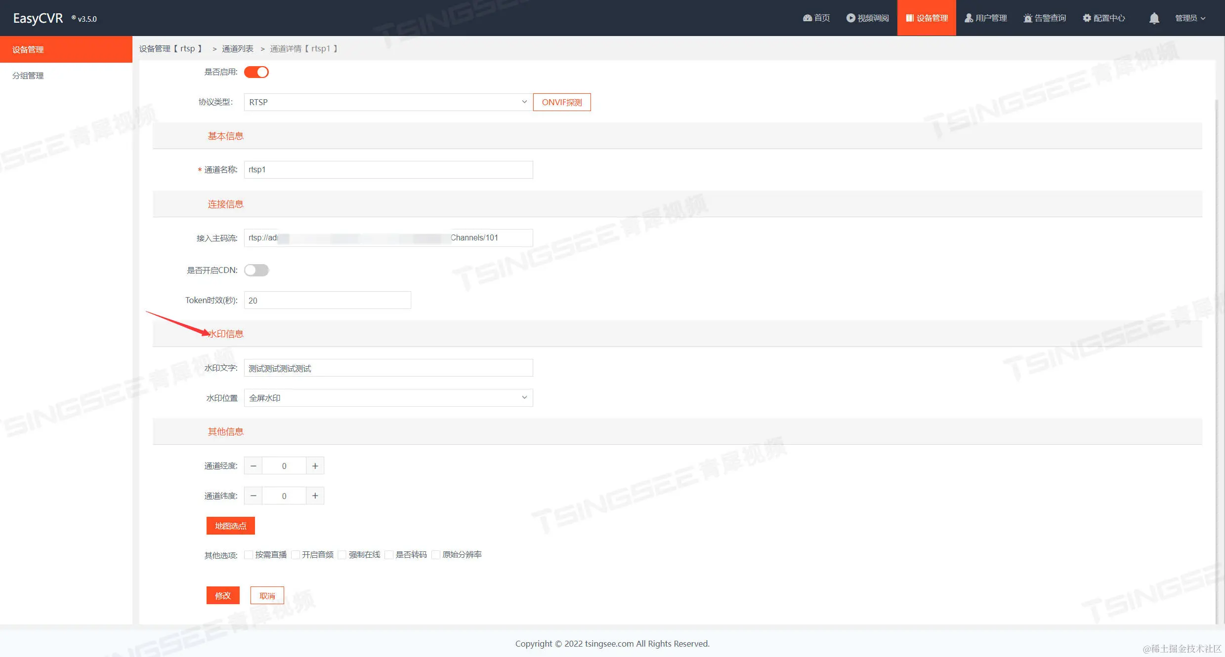 3)设置完成后,点击【修改】按钮,在任一播放器页面播放此通道,都会产生水印效果。