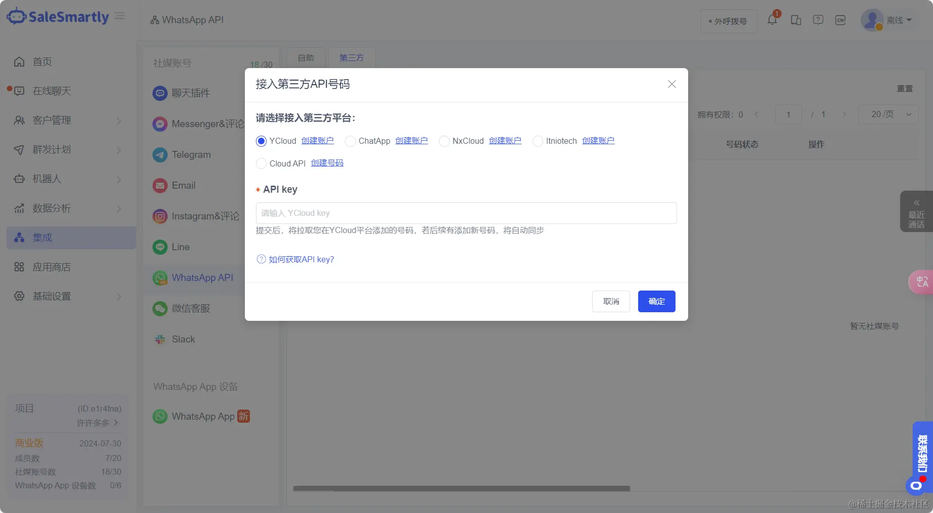 这个方式是在第三方平台注册好之后把API账号关联到SaleSmartly后台,合作的第三方平台有YCloud、ChatApp、NxCloud、Itniotech、Cloud API(Meta官方)。