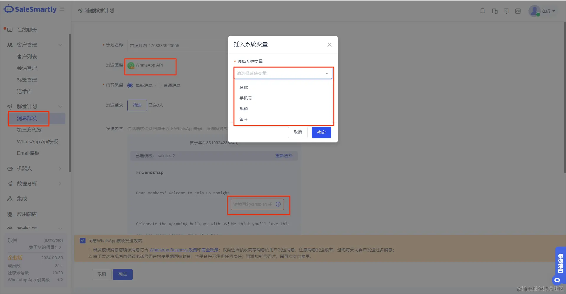 进阶一点的话可以定制群发信息。企业使用WhatsApp系统中预设好的客户名字来定制每条群发消息。个性化的群发消息有助于提高打开率和响应率,因为会给人感觉不是群发的广告或通知,让客户感受到被重视,从而增强客户的忠诚度。