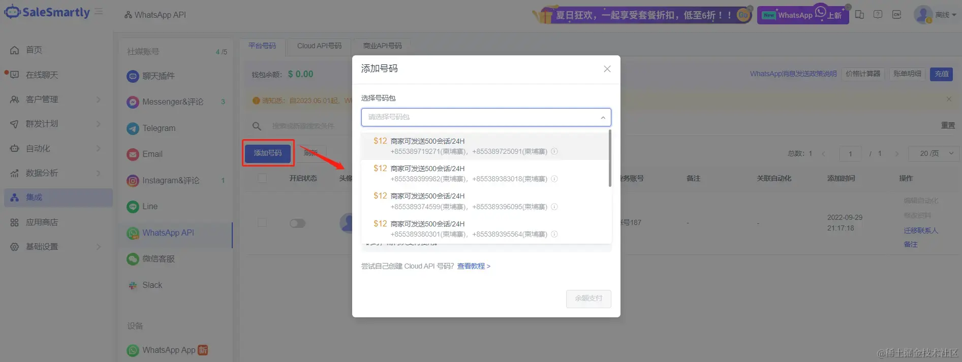 在SaleSmartly后台【集成】-【WhatsApp API】中找到添加号码,即可选择自助买号。