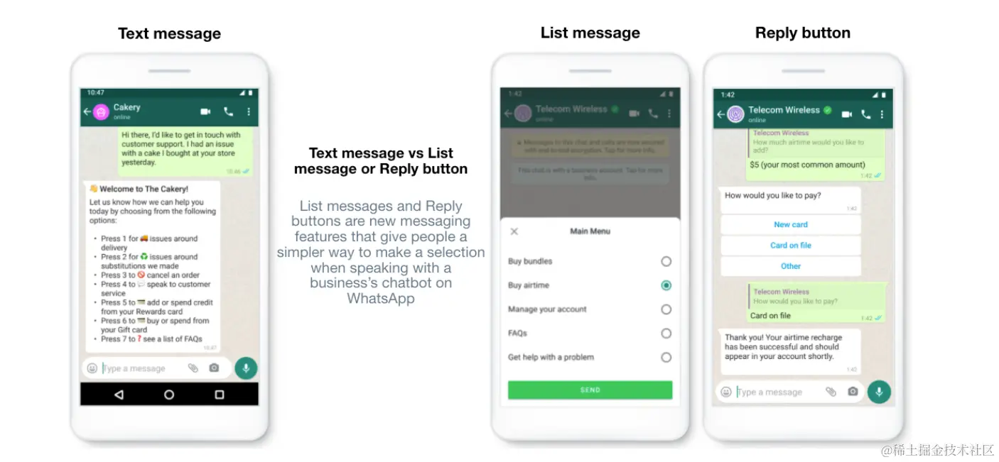 互动式消息分为两种主要形式:列表消息(List messenge)和回复按钮(Reply button)。