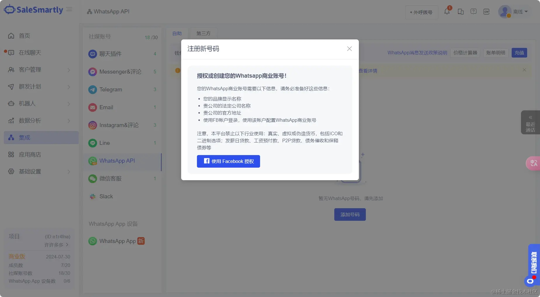 如果更加倾向于使用个人信息进行注册,可以在SaleSmartly的管理后台导航至【集成】-【WhatsApp API】部分进行自助注册。请点击界面蓝色边框内的【使用Facebook授权】按钮,并遵循系统指引完成后续操作流程。
