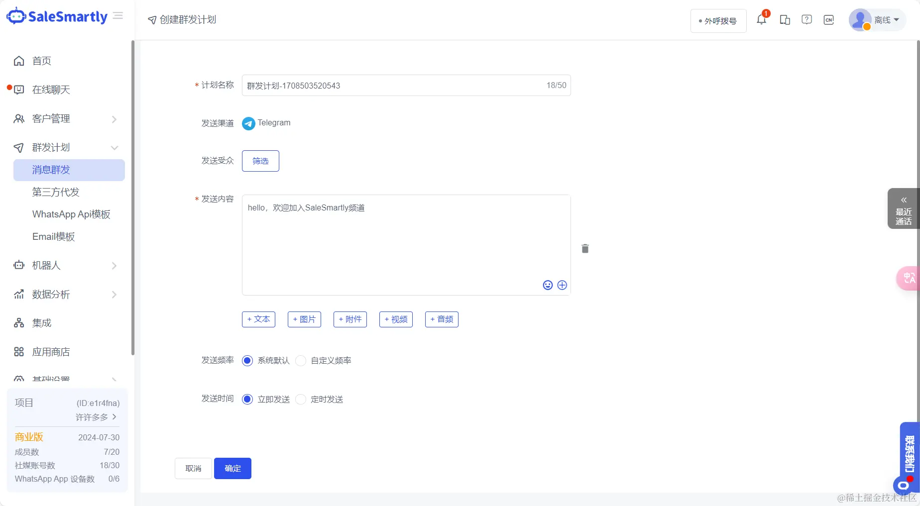 使用方法:打开SaleSmartly-【消息群发】,选中Telegram渠道后,选择好需要发送的受众和内容,支持文本、图片、附件、视频和音频内容,然后系统即可一键发送多条信息。