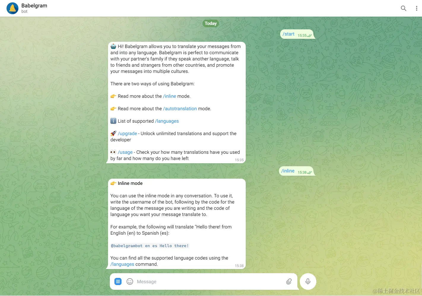 使用方法:需要先关注他们的频道@Babelgram News,然后点击/start和/inline。