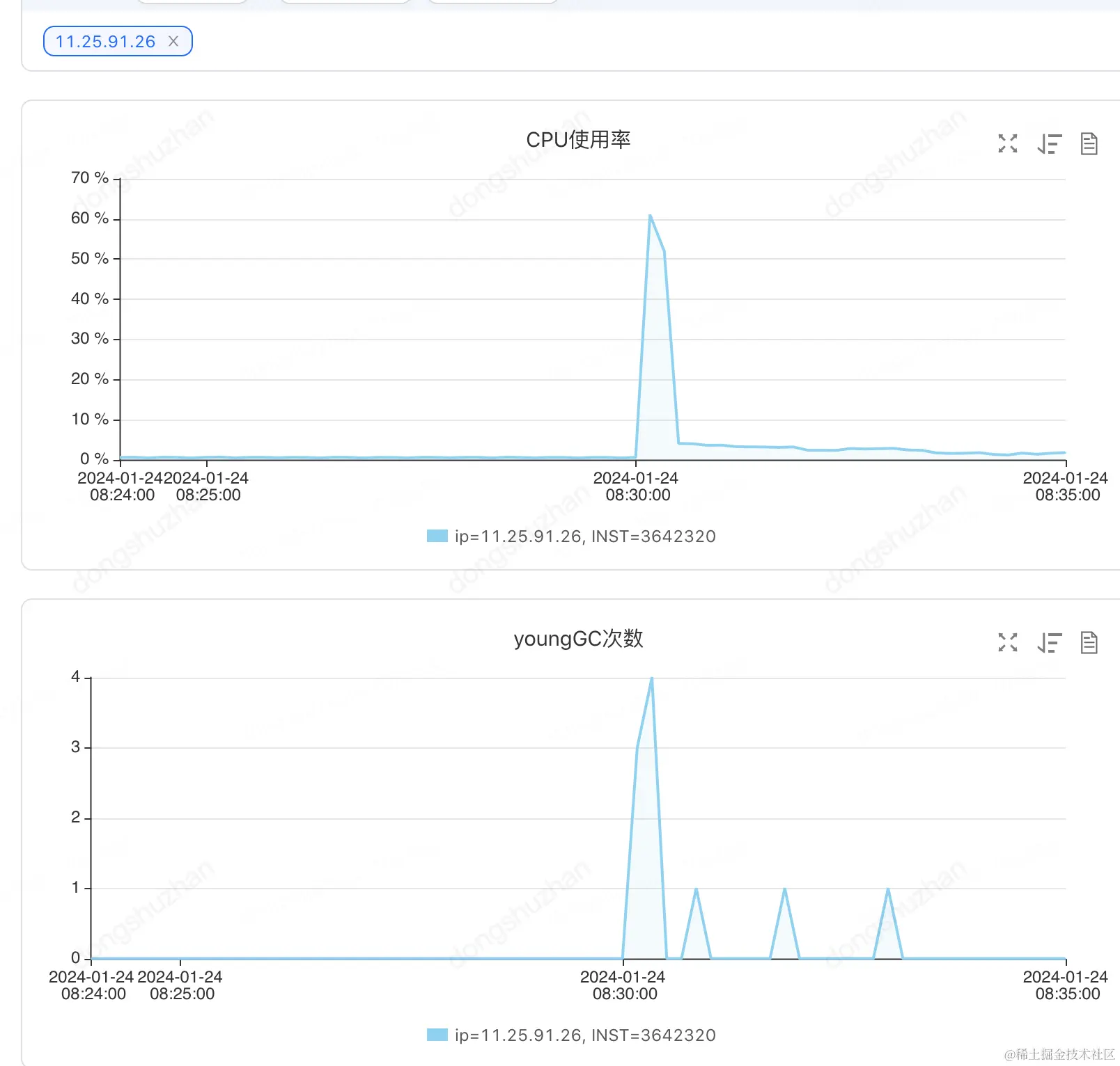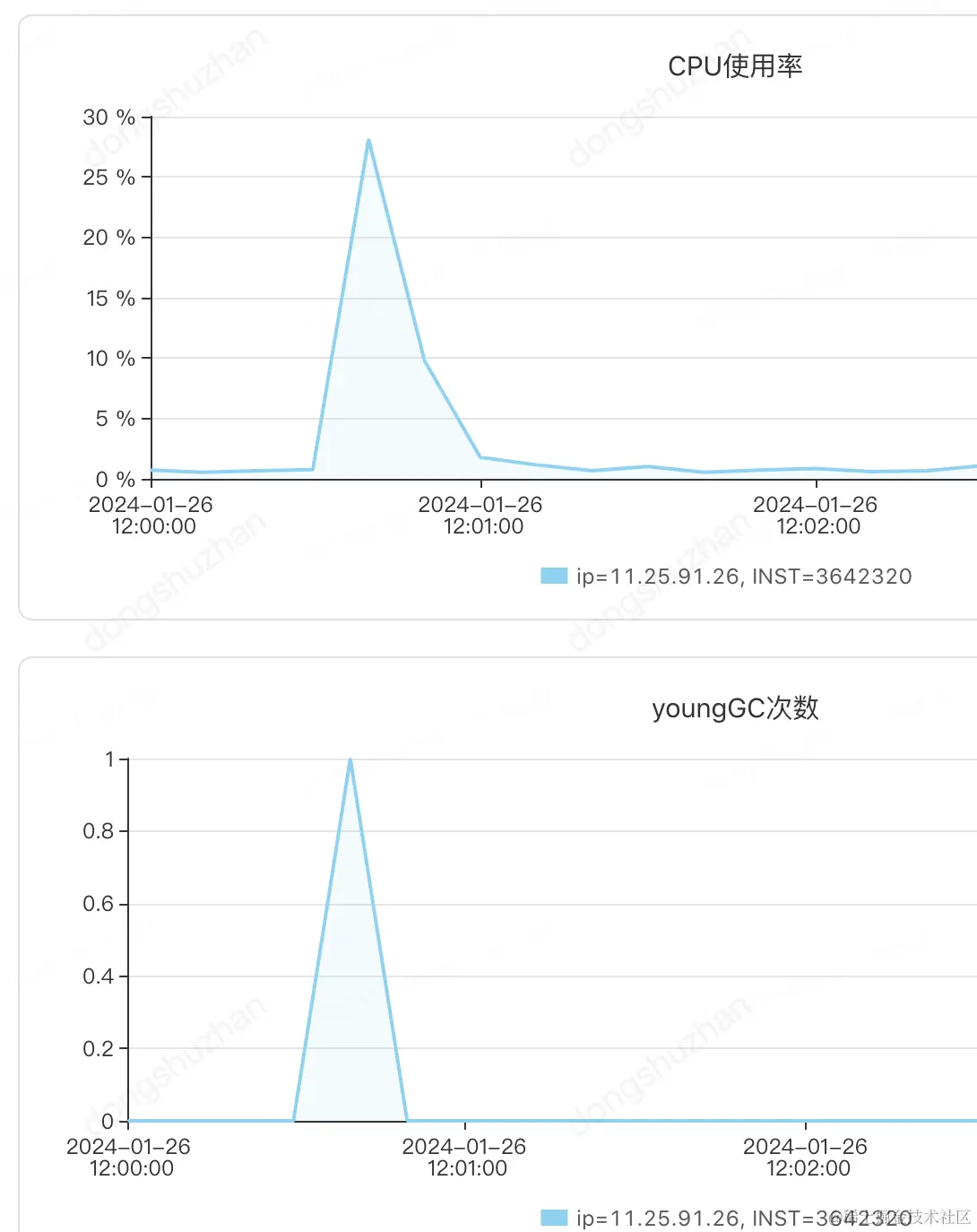 机器的监控如下cpu只用了28%,且只ygc了1次,任务执行时间30秒内完成。