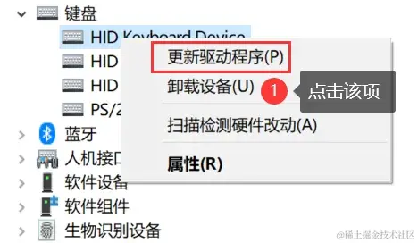 步骤4:右键点击有问题的键盘设备,点击【更新驱动程序】。按照提示完成驱动更新后,重新启动电脑。