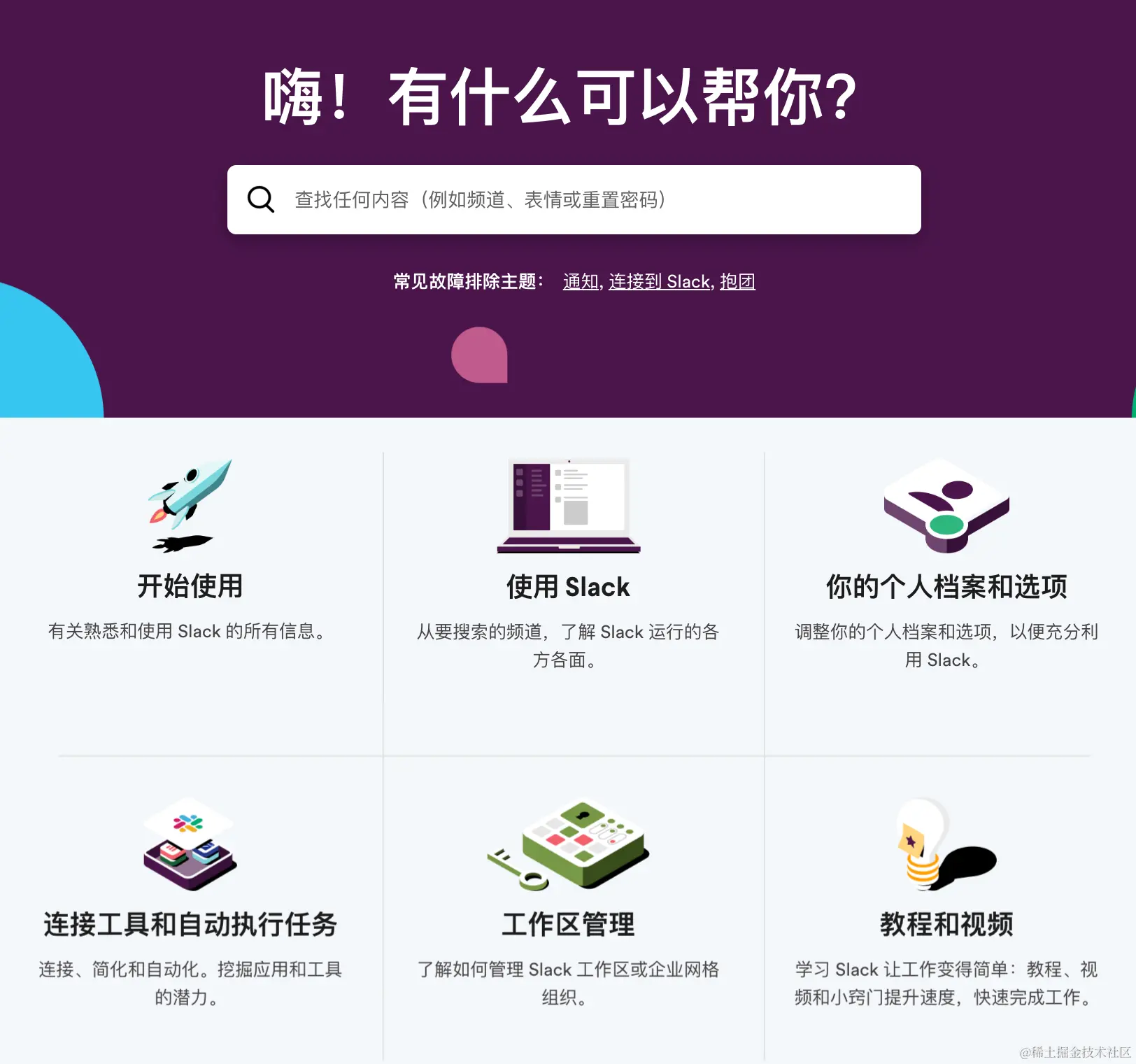 比如:Slack的教程知识库是一个最佳示例之一。他几乎涵盖了各方面的教程内容,非常容易的查询,因为教程中有非常清晰的步骤说明,配上图片、截屏示例、图表、GIF、甚至是视频的支持。