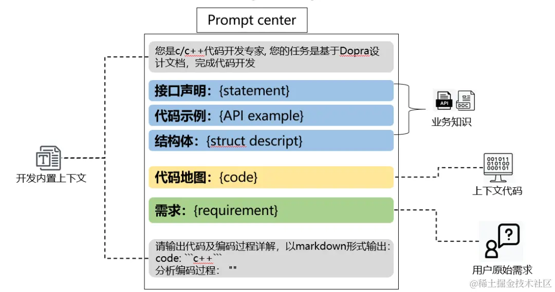 以某产品线Dopra开发场景为例,我们整理了开发手册、线下文档、社区平台以及开发者经验等数据,汇总成Dopra开发的领域知识,并将这些知识向量化,存储到向量数据库中。当用户输入需求任务后,通过RAG能力,我们可以获取与该任务相关的开发经验信息。将这些信息通过“领域经验”提示模板输入给大模型,从而显著提高大模型输出代码的正确性。
