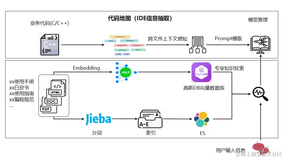 在 IDE 项目文件中检索跨文件信息;在向量数据库中检索 API 接口说明、工程规范信息。根据 prompt 模板,将用户的需求描述与上述检索信息拼接成完整的 prompt,输入给大模型。