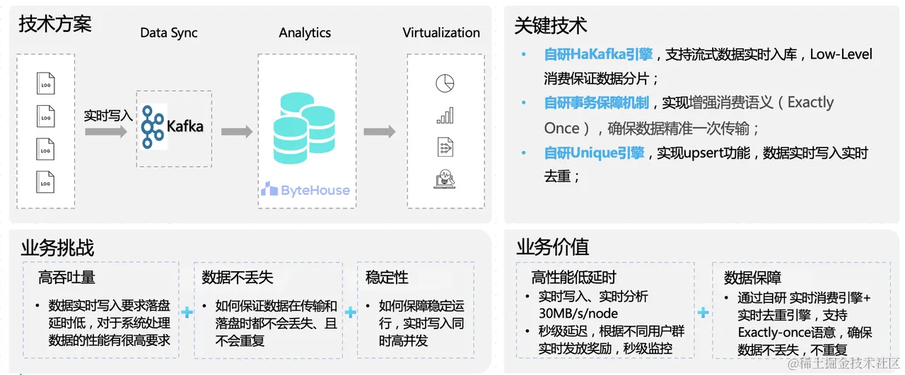 再者,在实时营销场景中,ByteHouse采用自研的Kafka引擎支持流式数据的实时写入、入库,保证数据传输的及时性,从而支持实时的业务决策;并且自研的Unique引擎能够实现实时的upsert语义,确保数据实时写入、实时去重,从而避免数据唯一性的问题。ByteHouse凭借其在数据处理领域的领先技术,为企业在春节期间的营销实时监控领域提供了数据分析和预测、目标客户精准推送、广告效果评估和优化的强大技术支持,从而提高春节期间的营销效果。