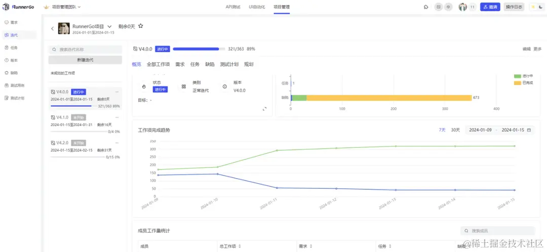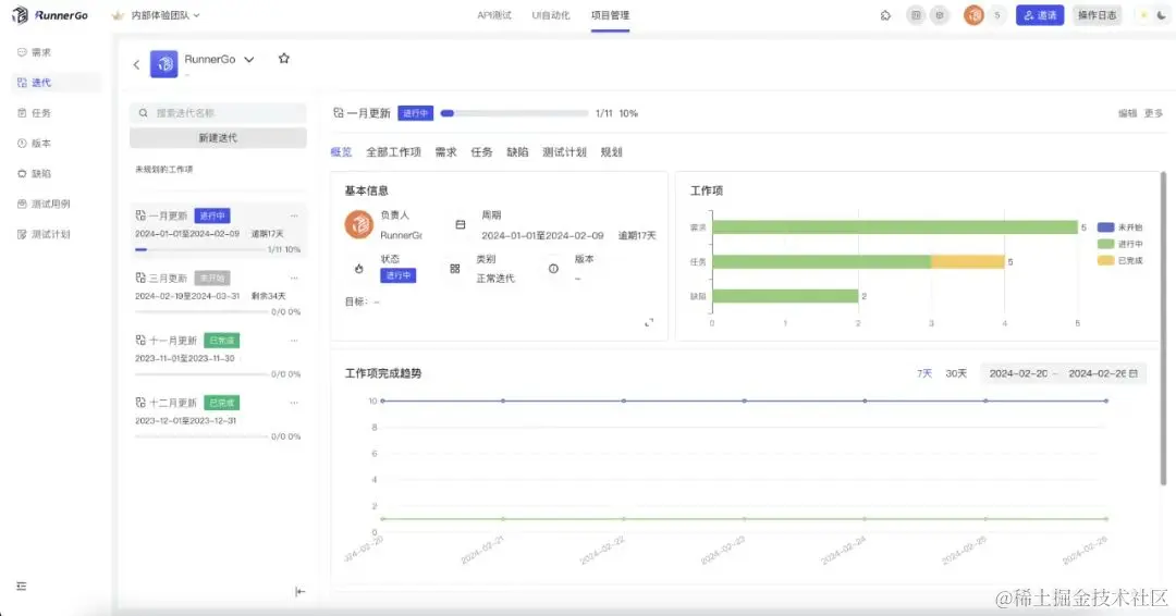 RunnerGo不仅仅是一个测试工具,它还内置了项目管理系统,这一点对于希望减少内部沟通成本、提高项目管理效率的团队来说具有极大的吸引力。通过RunnerGo,团队能够对缺陷、需求、任务、测试用例和测试任务进行全面的管理,从而拥有更清晰的项目进度视图,促进了研发与测试团队的协同工作,减少了项目的内耗。