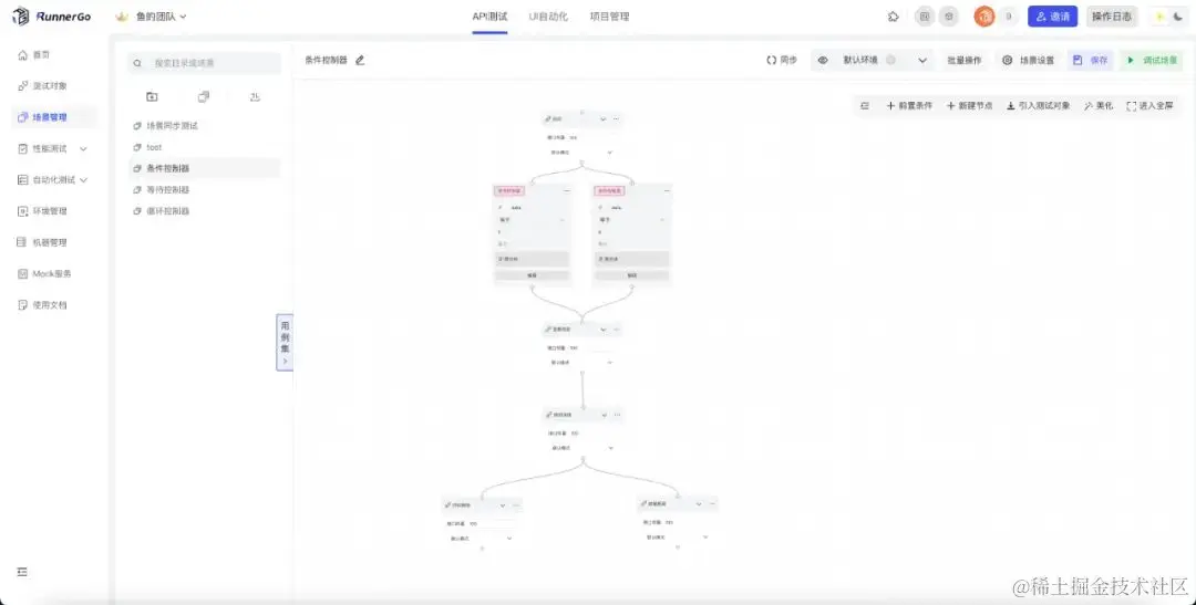 在测试过程中模拟真实且复杂的场景对于发现潜在问题至关重要。RunnerGo引入场景管理功能,摆脱了繁琐的代码编写。通过简单的可视化操作,测试人员可以轻松创建和管理多个场景。RunnerGo提供了丰富的场景组件库,包括请求、断言、数据处理和流程控制等,以满足各种测试需求。测试人员只需将这些组件拖放到场景中,flow形式链接关系并设置参数即可,无需编写任何代码。