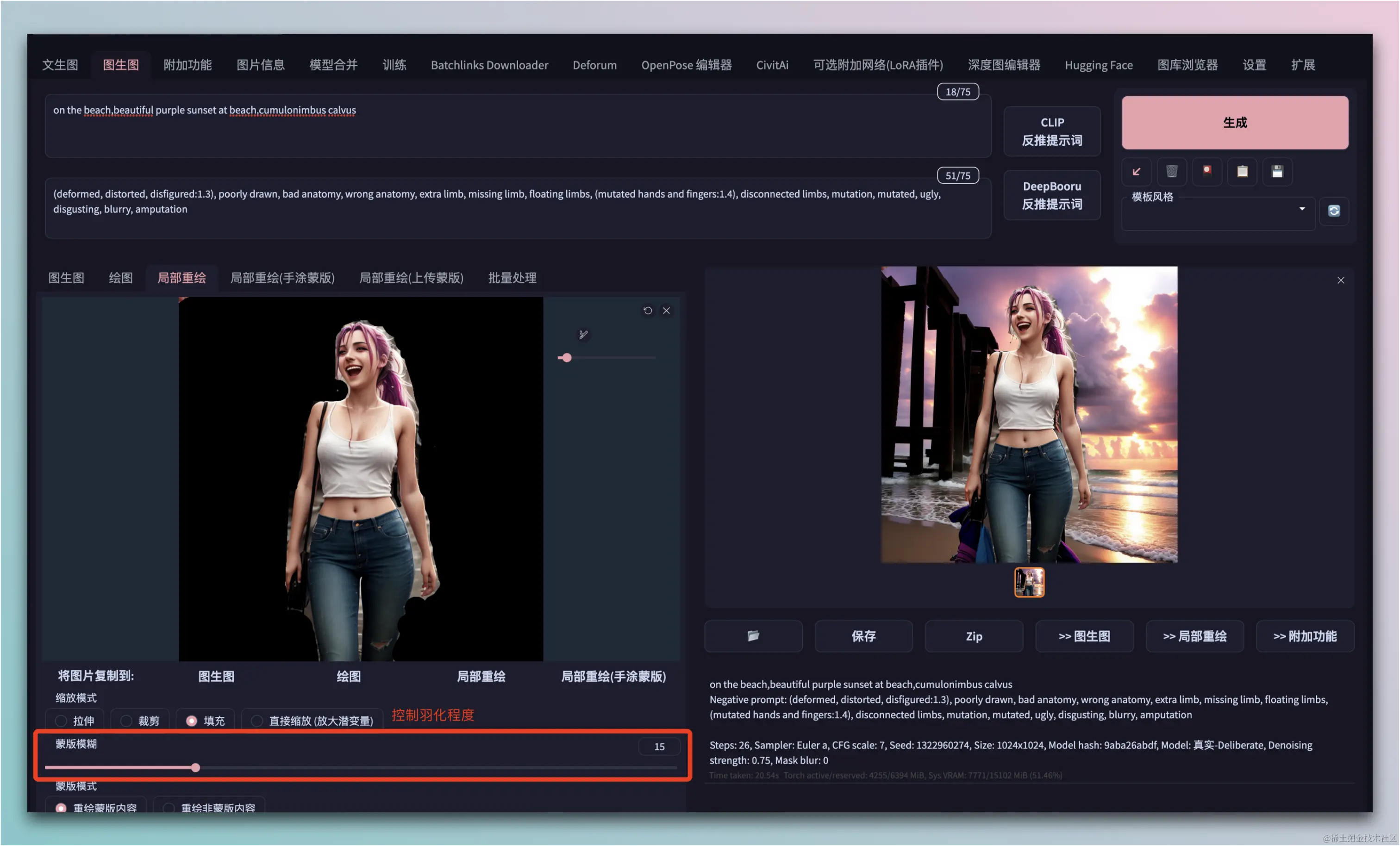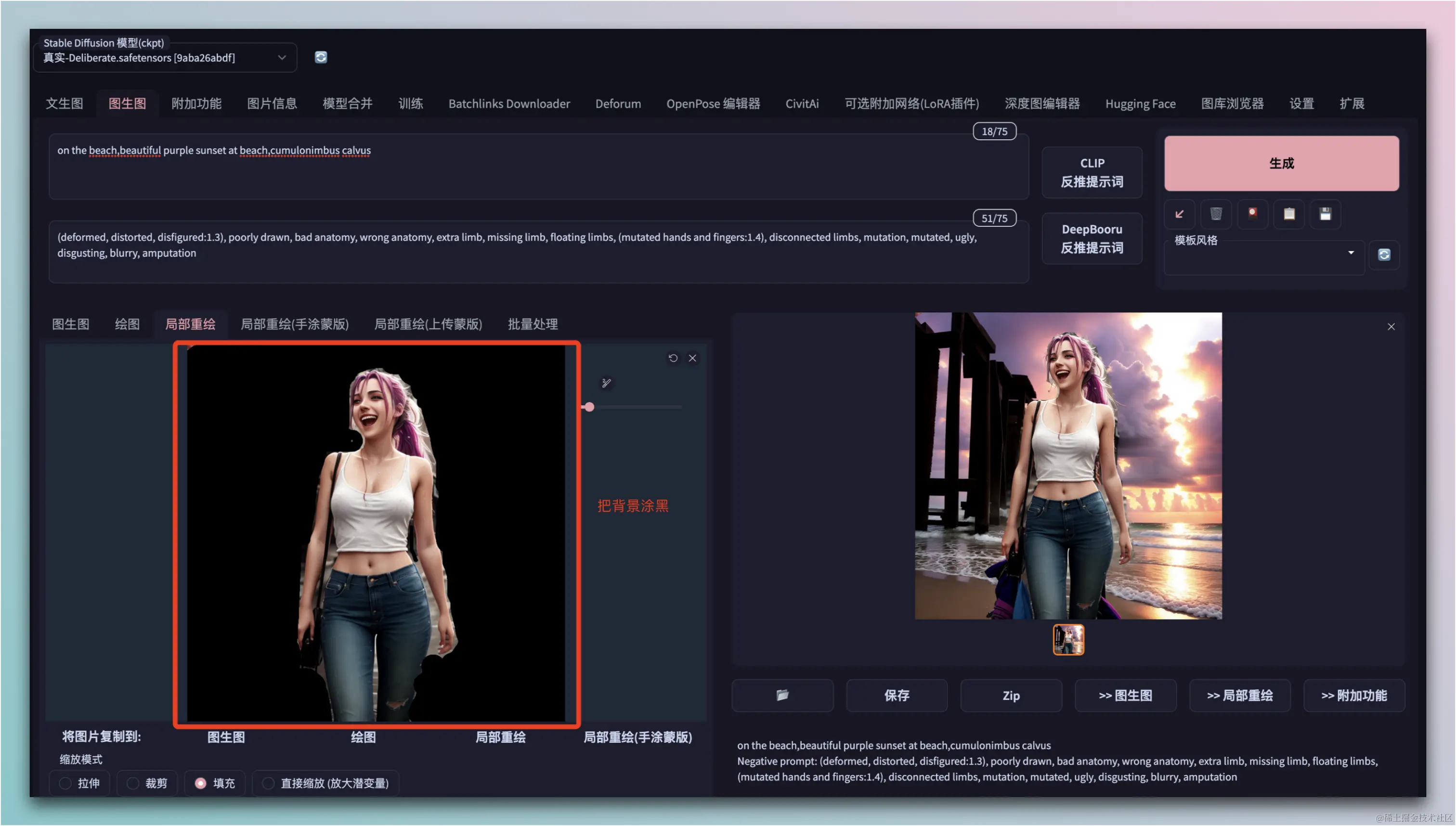 根据前面提供的模特数据在文生图生成一个模特,接着点击发送到 局部重绘