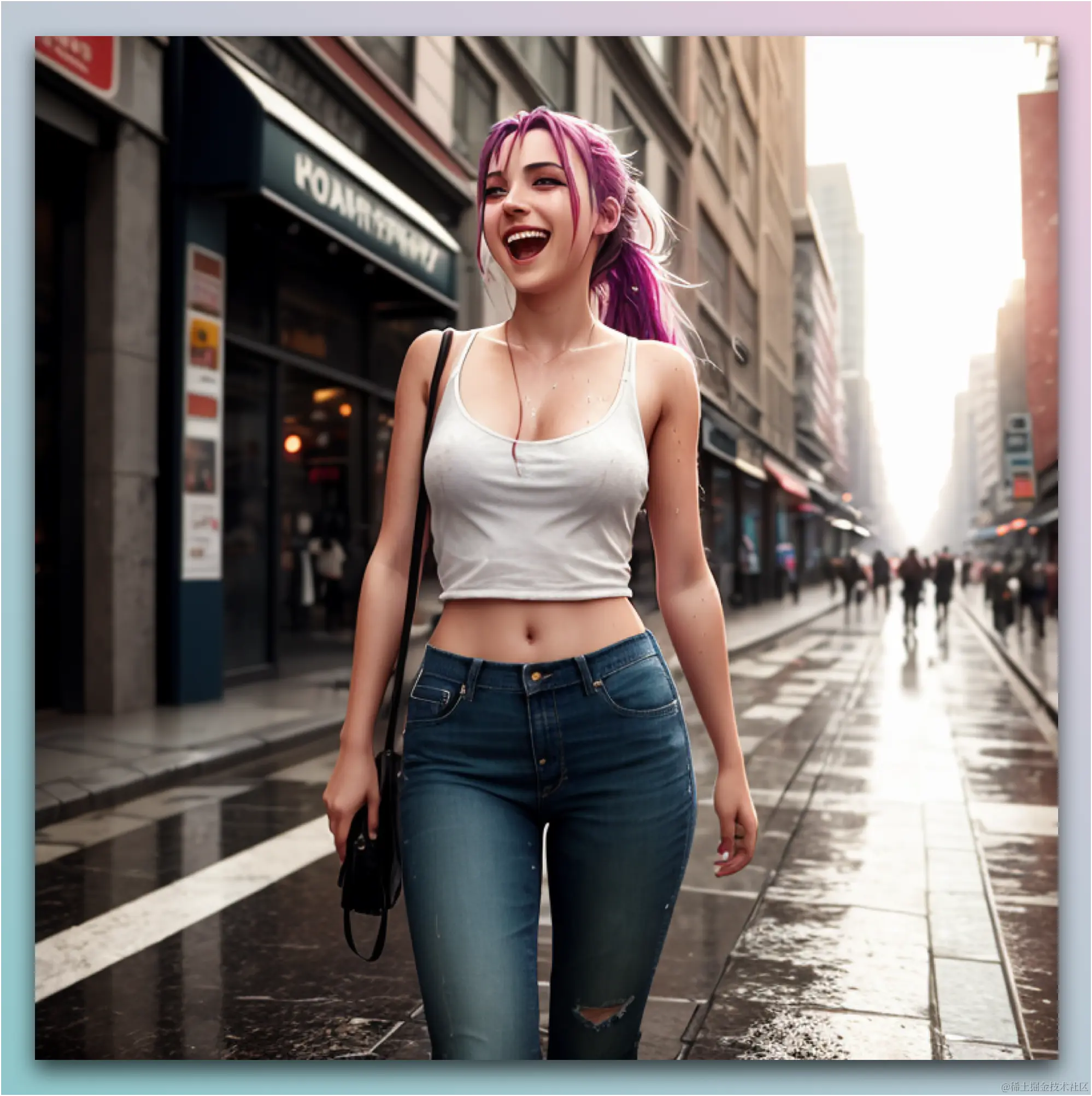 a young woman, street, laughing, ponytails, (hdr:1.3), (muted colors:1.2), dramatic, complex background, cinematic, filmic, (rutkowski, artstation:0.8), soaking wet,pov,((full body)),jeans,high heel boots