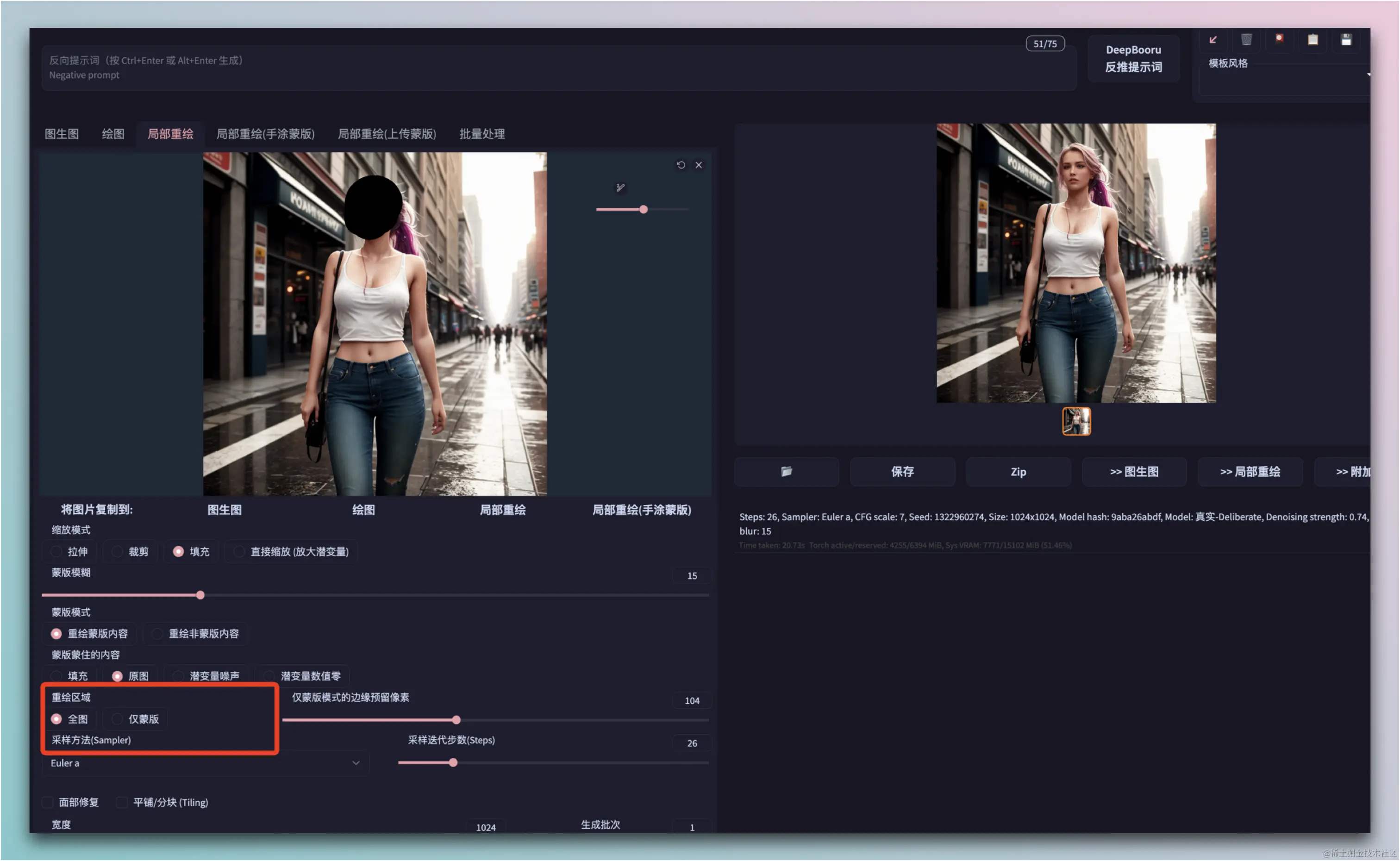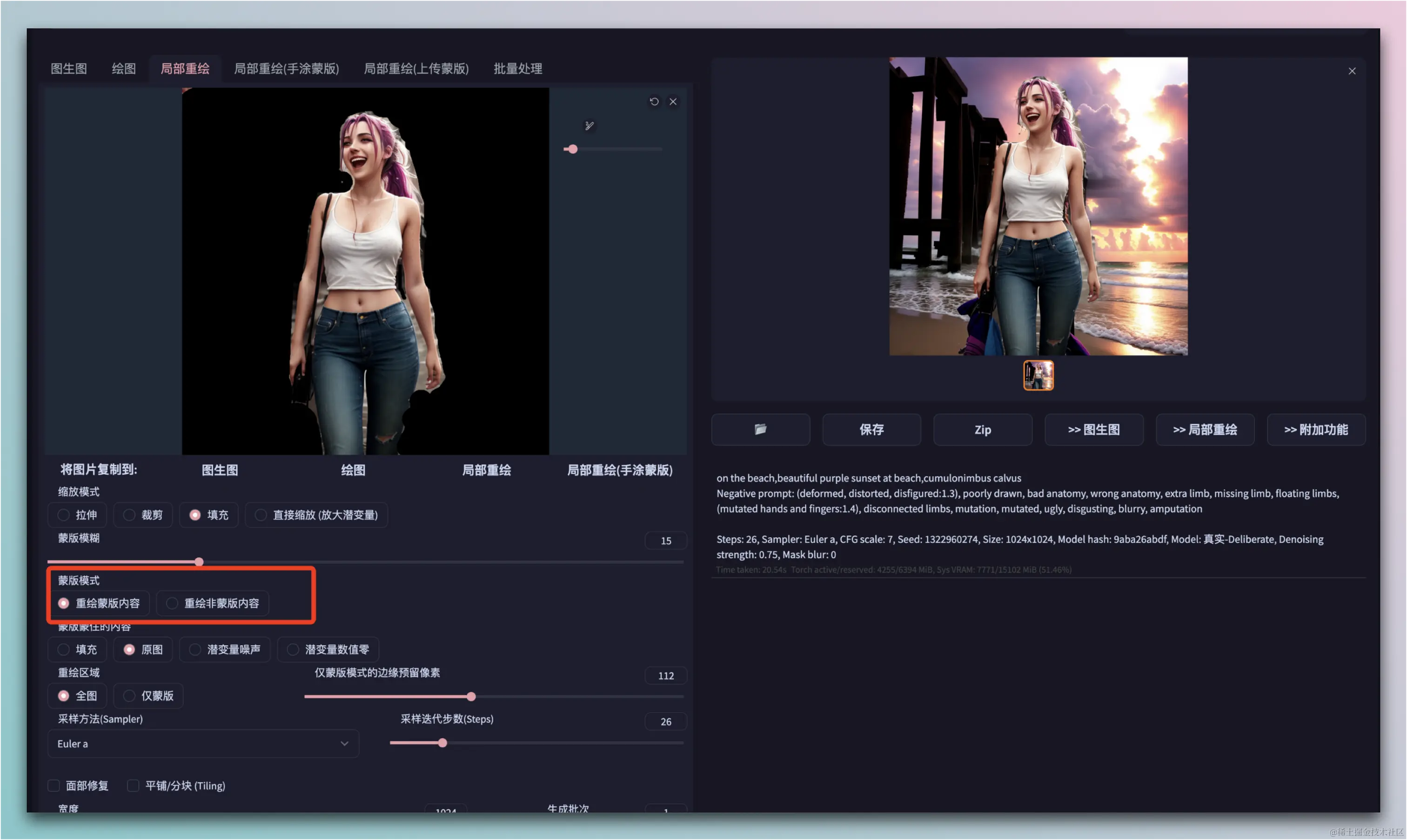 如果我们希望对局部做高清修复。那么除了前面我们讲到的勾选高清修复、调大分辨率外。仅模版 模式绝对是性价比最高的一种高清修复的方式。