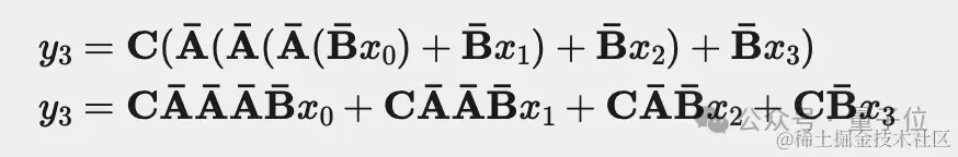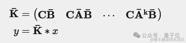 由于其中三个离散参数A、B和C都是常数,因此我们可以预先计算左侧向量并将其保存为卷积核。这为我们提供了一种使用卷积计算y的简单方法,如以下两个方程所示(Mamba论文中的3a和3b):