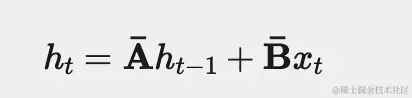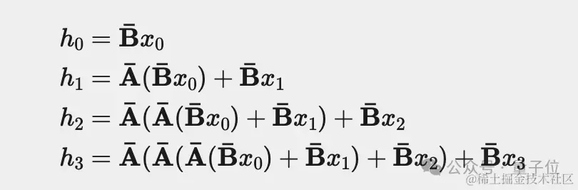 该方程形成一个递归:在每一步,我们通过将先前存储的值添加到当前输入来计算新值。现在,让我们再次看看更新之后Mamba隐藏状态的循环。