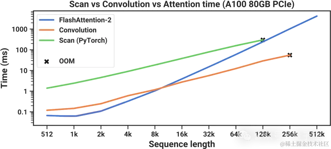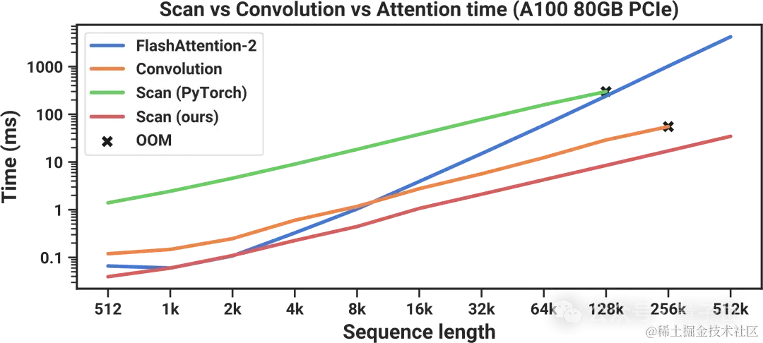 尽管当序列长度为128000个token时,扫描似乎在运行时赶上,但还是耗尽了内存。