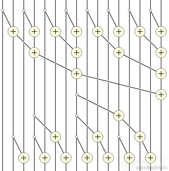 在下图中,我们可以看到正在运行的并行前缀和算法,其中每条垂直线代表数组中的一项。