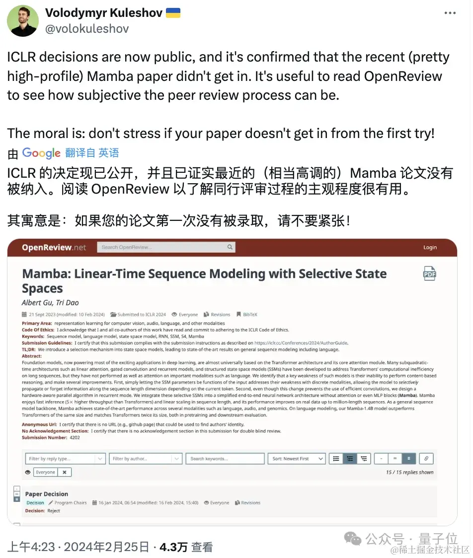 被尊为Transformer挑战者的Mamba,已正式被ICLR拒绝。