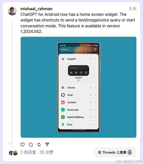根据 The Verge 消息,近日 ChatGPT 正在测试 Android 平台上的屏幕小组件,类似于手机中的悬浮窗,按住 Android 手机主屏幕上的空白位置就可以调出 ChatGPT 的部件菜单。
