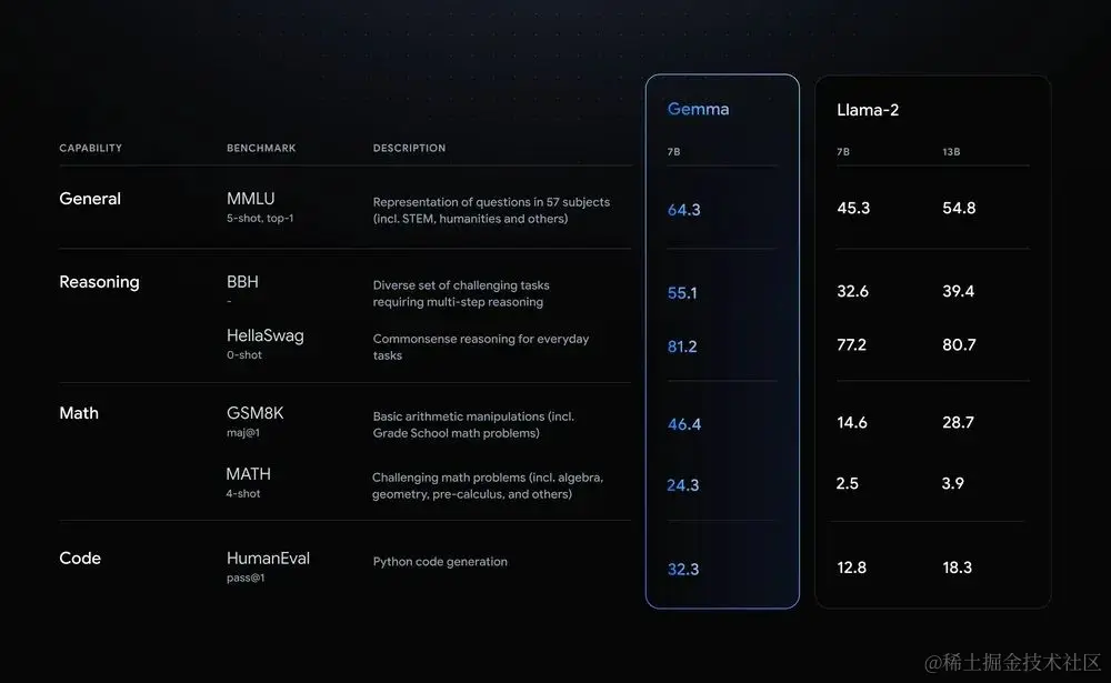 整体来看,Gemma 是由 Google DeepMind 和其他 Google AI 团队共同开发而成,采用与 Gemini 模型相同的研究和技术,建立在序列模型、Transformer、基于神经网络的深度学习方法和分布式系统上大规模训练技术至上。模型训练的上下文长度为 8192 个 token。