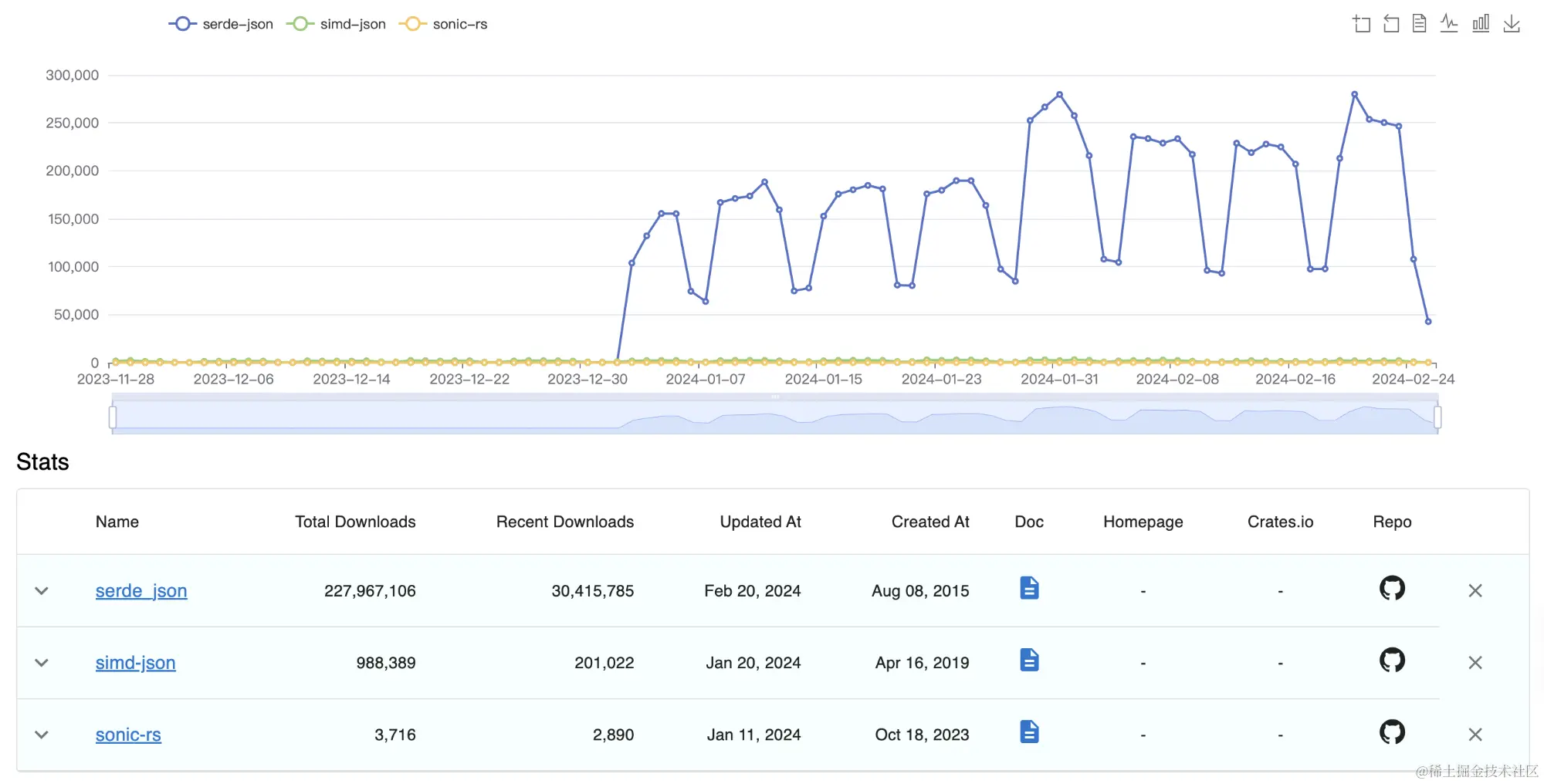 其实,在大部分情况下,serde-json已经能够满足我们的需求了。但是,在一些特殊情况下,例如数据量过大,此时serde-json就有点吃力了。所以,市面上又有了一些提高 JSON 解析性能的crate。(simd-json/sonic-rs)