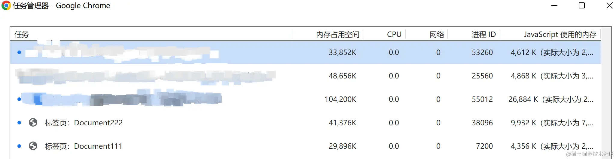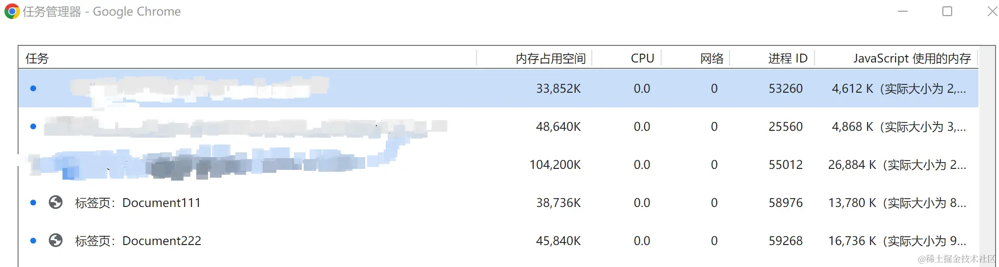 当我们在10w次的for循环中产生了闭包,浏览器中的JS使用内存将会非常大,我们可以右击Chrome标签栏打开任务管理器,就可以查看当前标签的性能指标
