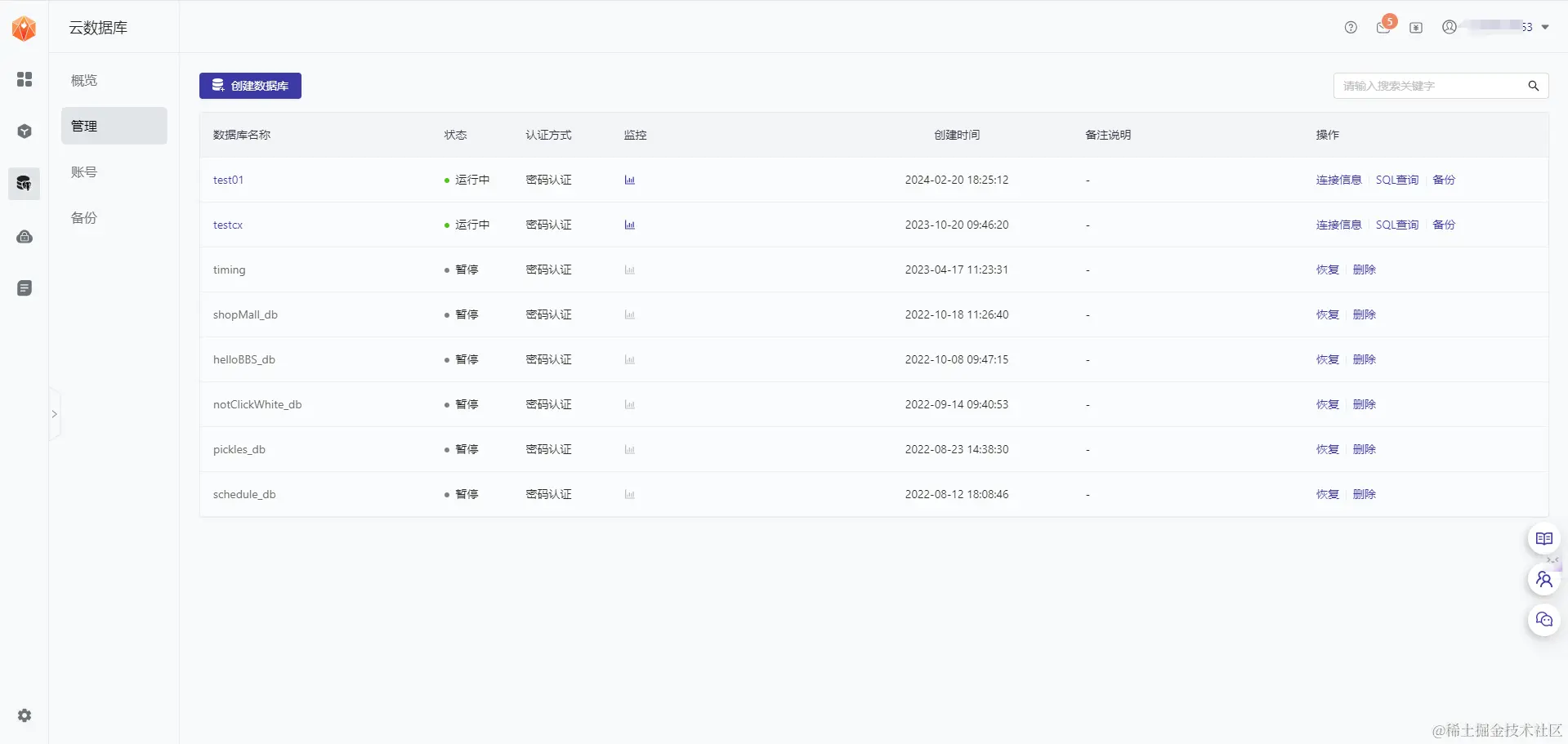 MemFireDB提供云数据库,用户创建数据库后可以自助式的获得数据库资源。MemFireDB用户可以根据需要自助的进行数据库管理,包括创建数据库、删除、连接、备份等功能。