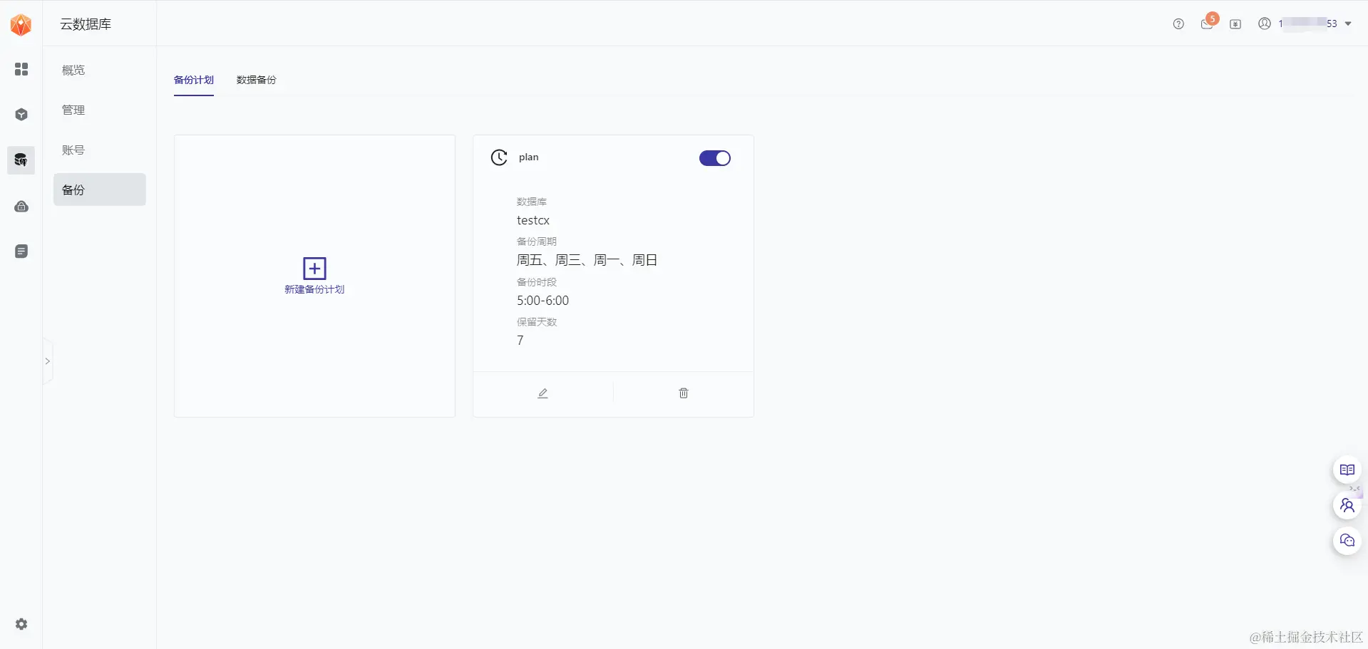 MemFireDB提供灵活的数据备份计划,支持手动备份、自动备份两种方式,将关键核心的数据备份到第三方存储,为用户的云上数据库提供强有力的保护,保证数据不丢失。