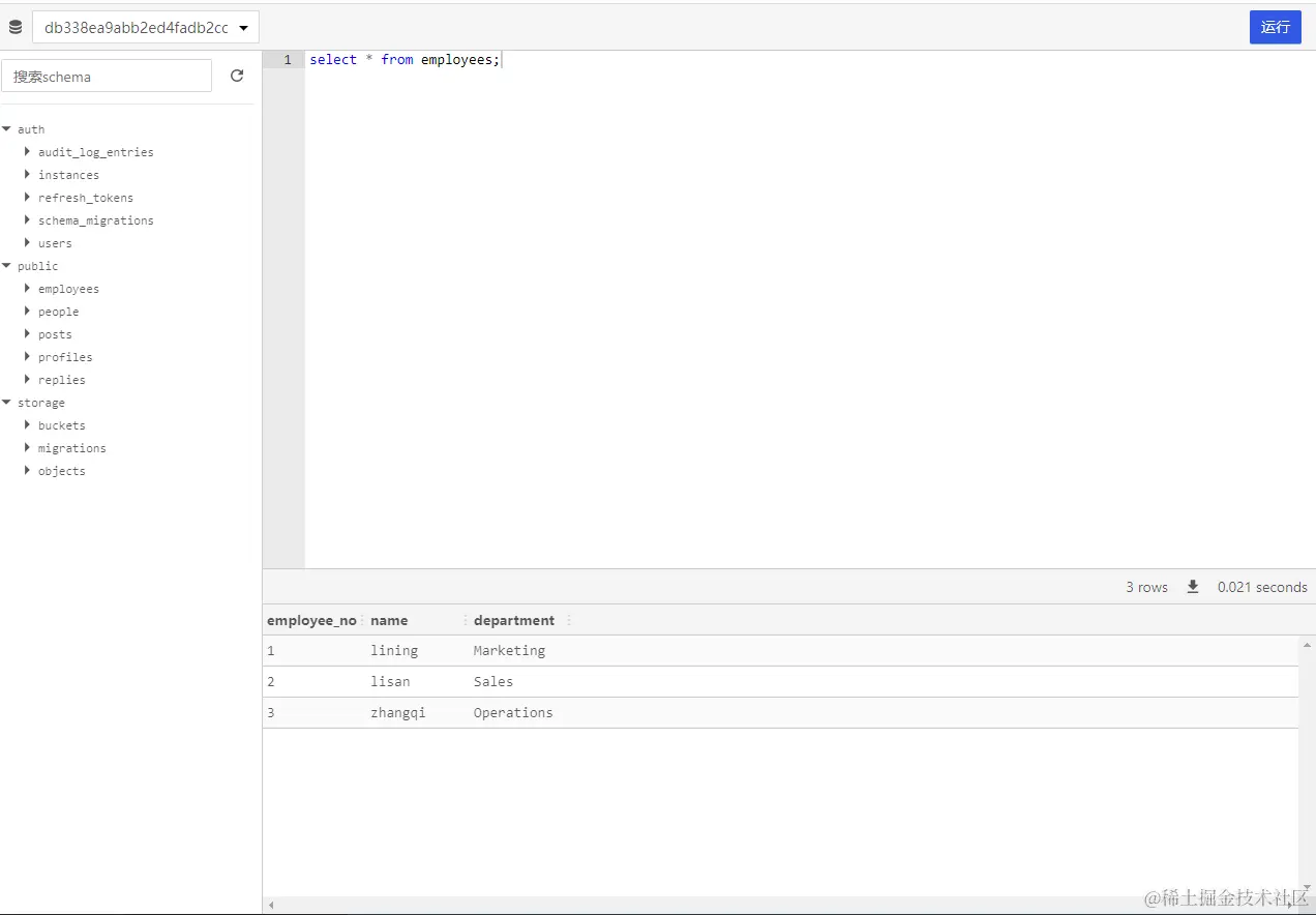 MemFireDB提供了在线可视化SQL编辑器,以树形结构来展示数据库,数据表结构信息,提供可视化SQL编辑界面,开发人员可便捷编辑SQL命令并执行,查看执行结果,将执行结果以CSV等多种结构导出到本地。