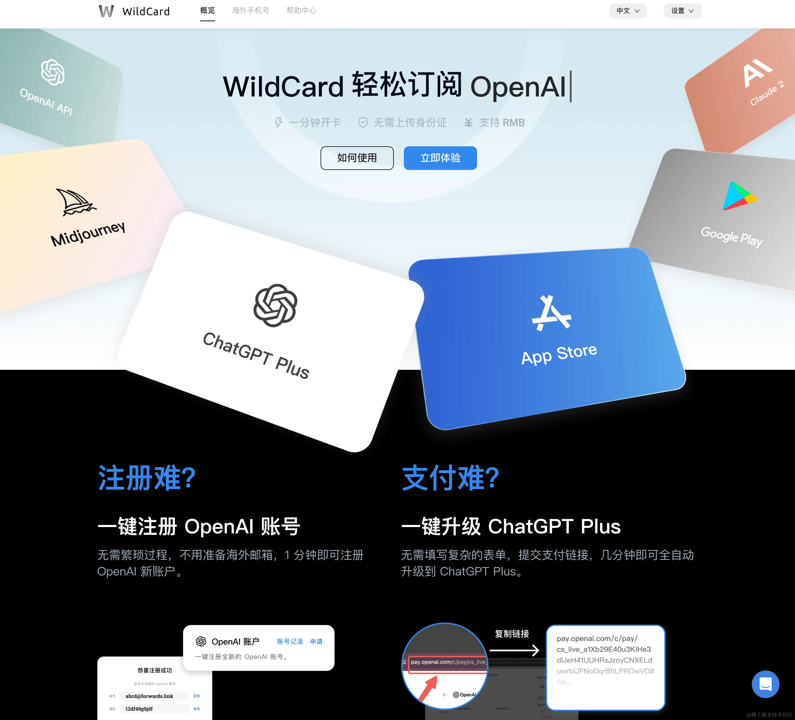 - 服务齐全:目前我最常用的 openai 升级会员(GPT4),但是 bewildcard 也可以针对 midjourney(绘图),claude 等开通其他注册服务