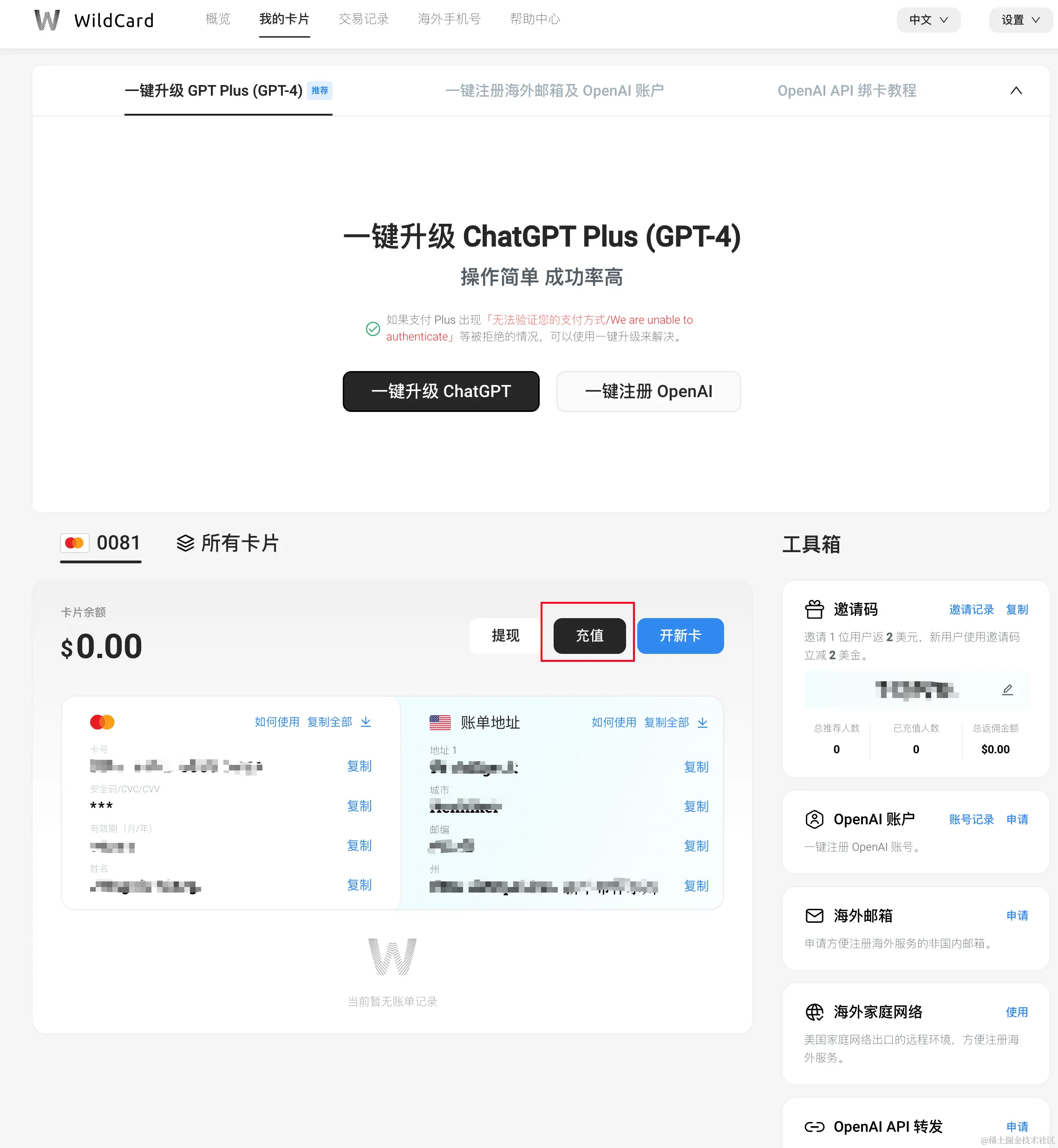 第一步也就是先进行 wildcard 开卡,这里可以通过这个链接注册,获取 2 美金的优惠 bewildcard.com/i/GPT702
