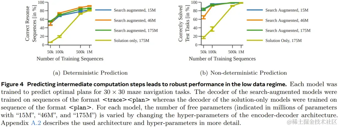 可以看到,和上一个实验一样,通过使用执行轨迹进行训练,搜索增强型模型的表现优于仅使用解训练的模型。