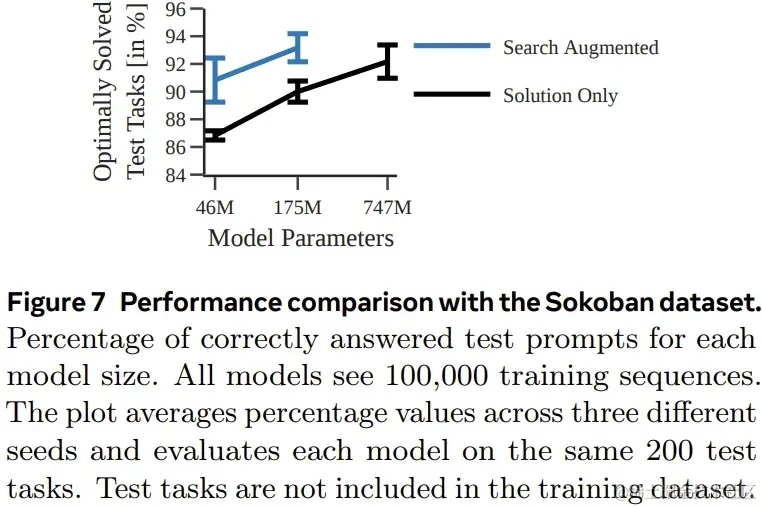 整体而言,尽管当使用的训练数据集足够大和足够多样化时,仅使用解训练的模型也能预测得到最优规划,但当数据量少时,经过搜索增强的模型的表现明显好得多,并且也能更好地扩展用于更困难的任务。