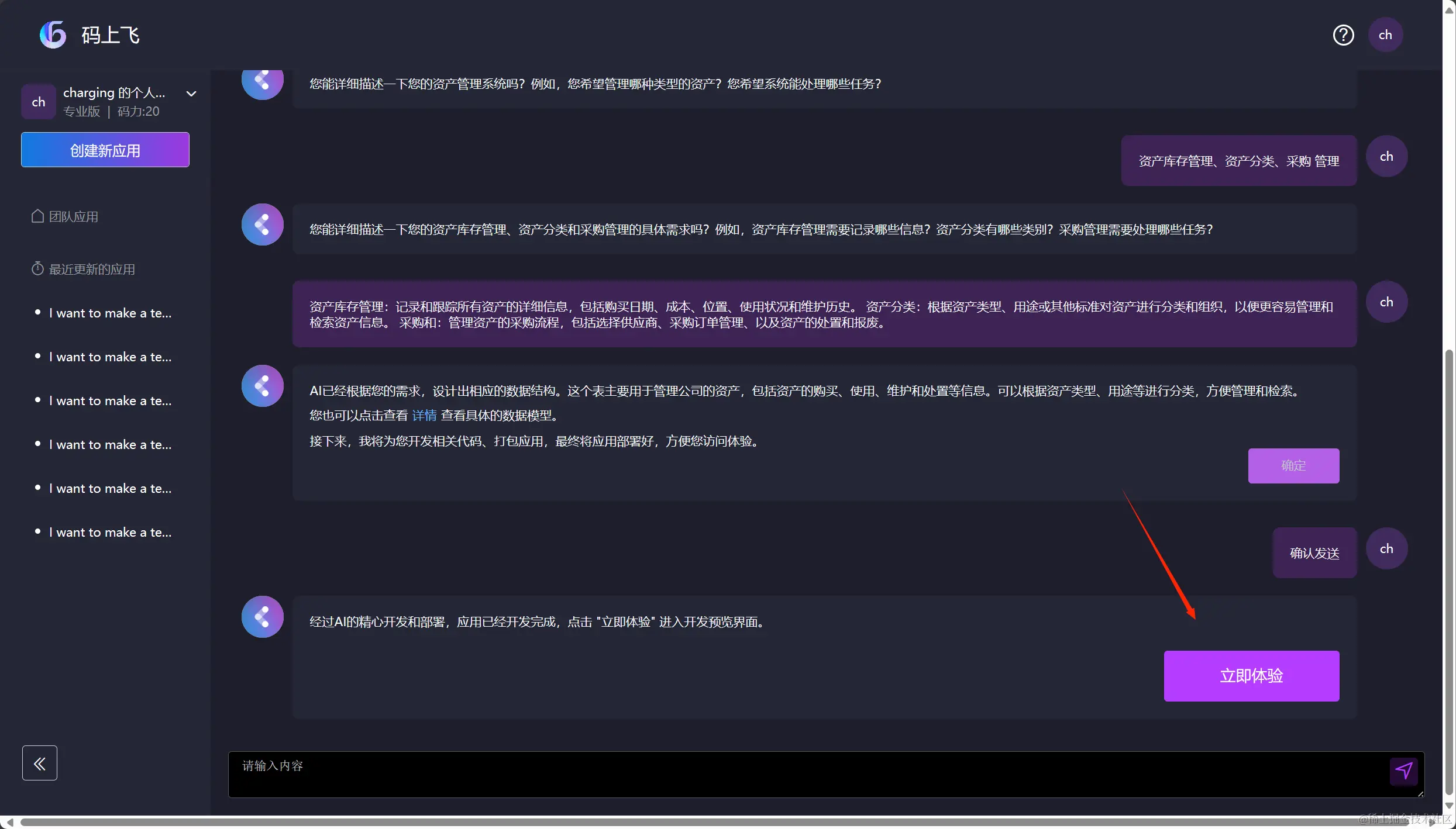 第四步:根据小飞飞的提示进一步阐述我们的需求,并查看小飞飞为我们制作的应用数据结构,查看无误后,点击确定,让小飞飞帮助我们完成软件的