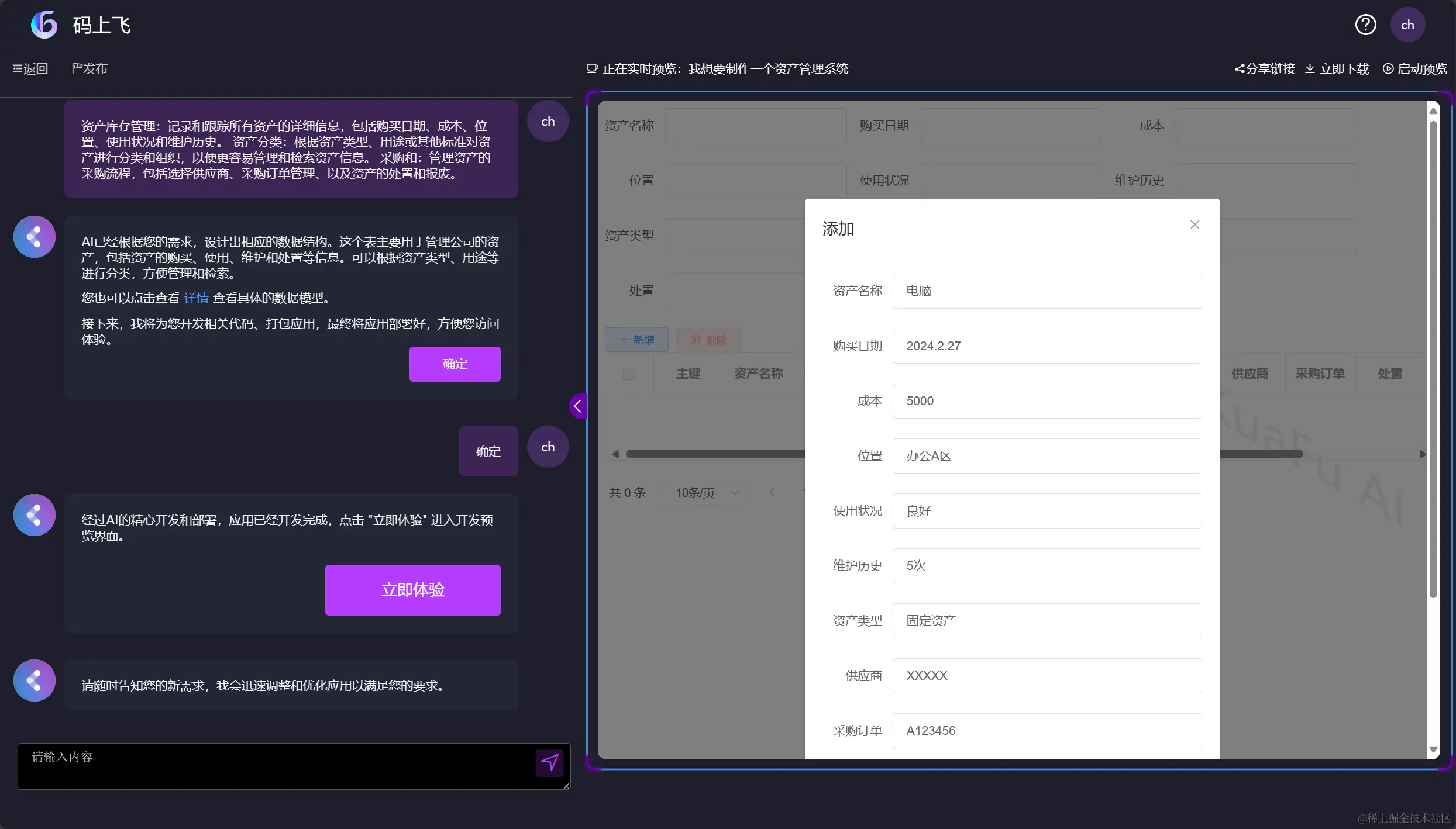 第五步:点击立即体验,在预览界面对资产管理系统进行应用