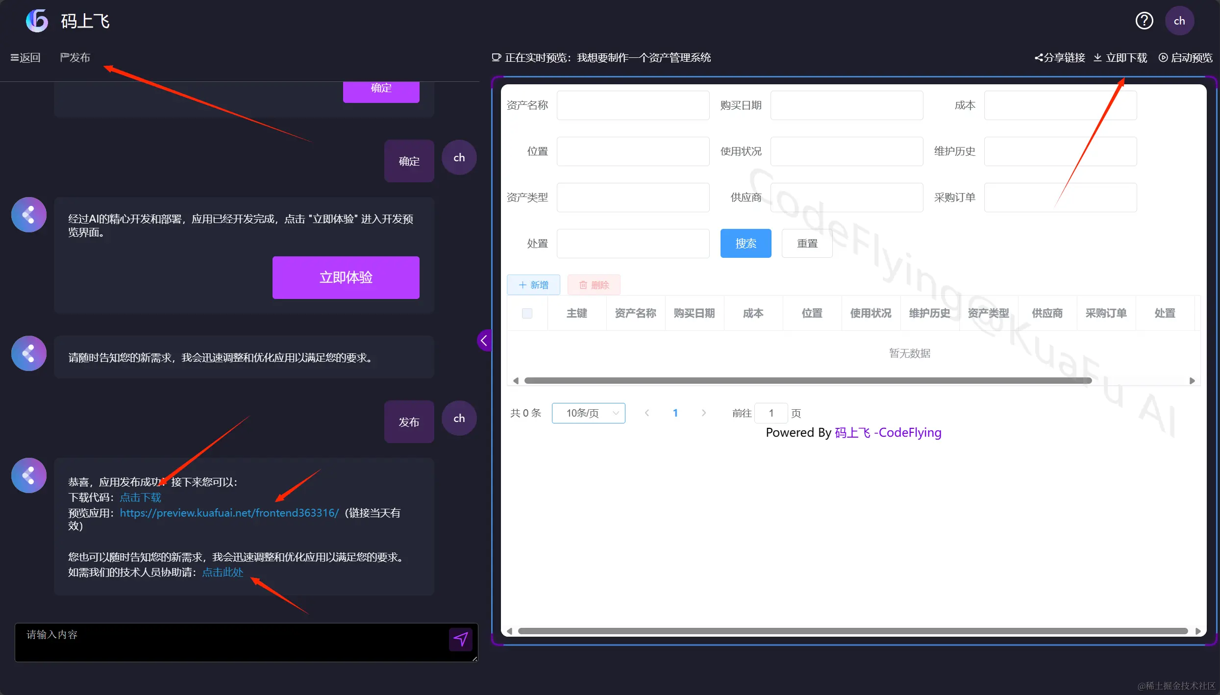 第六步:在预览确认无误后,可以点击下载代码,也可以点击小飞飞提供的临时链接