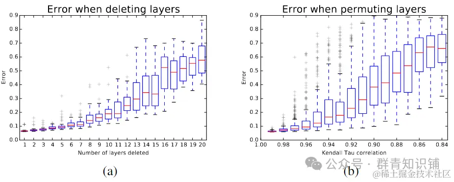 如图当从残差网络中随机删除几个模块时,误差平稳增加。通过重组构建块重新排序残差网络时的错误。随着重新排序程度的增加,误差也会平稳地增加。这些结果与人们对集成的期望相似。