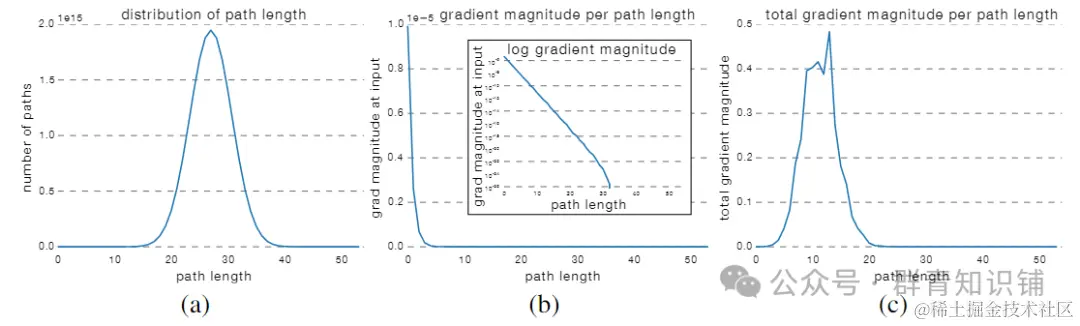 为了找到模型输出,论文首先展示了所有可能的路径长度 的分布,这遵循二项式分布。其次,通过不同长度的路径 记录网络第一层上诱导了多少梯度,这似乎与梯度通过的模块数量大致呈指数衰减。最后,可以将这两个函数 相乘,以显示梯度来自某个长度的所有路径。虽然中等长度的路径很多,但超过 ∼20 个模块的路径通常太长,无法在训练期间贡献明显的梯度。这表明残差网络是短网络的大型集成。