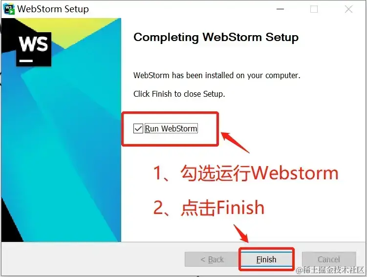 5.安装完成后,勾选 Run Webstorm,点击 Finish 运行软件