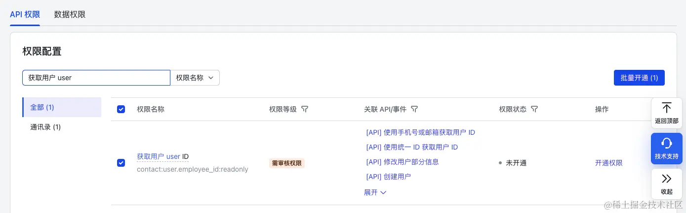 再搜索获取用户 user ID,开通获取用户 user_id 权限,如下图:
