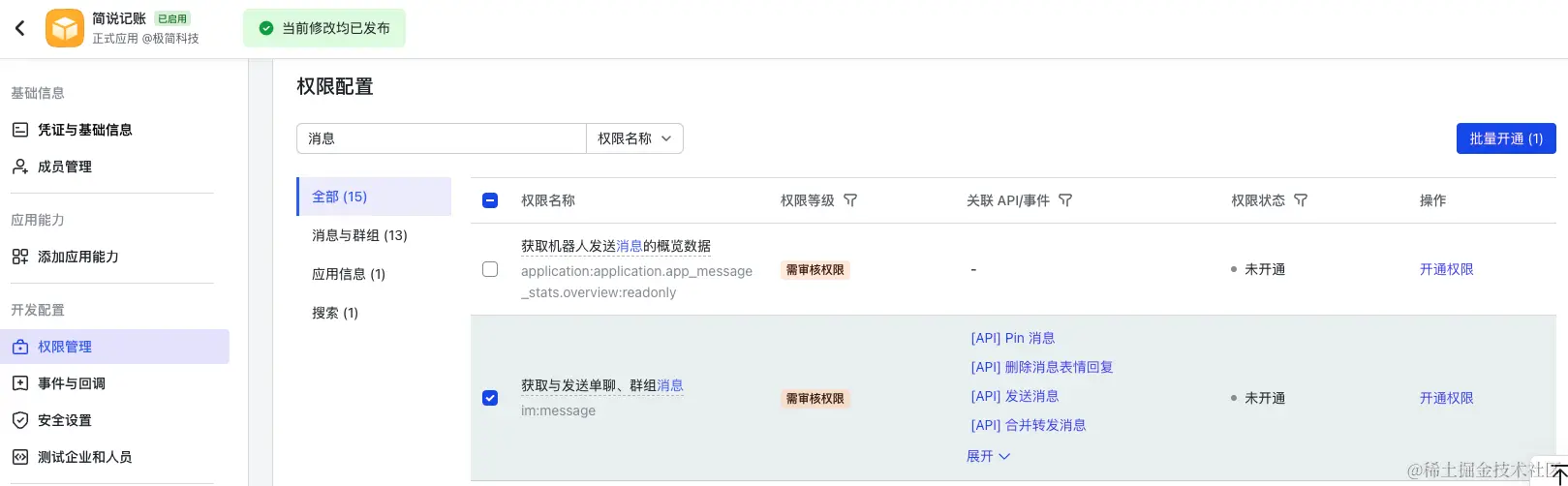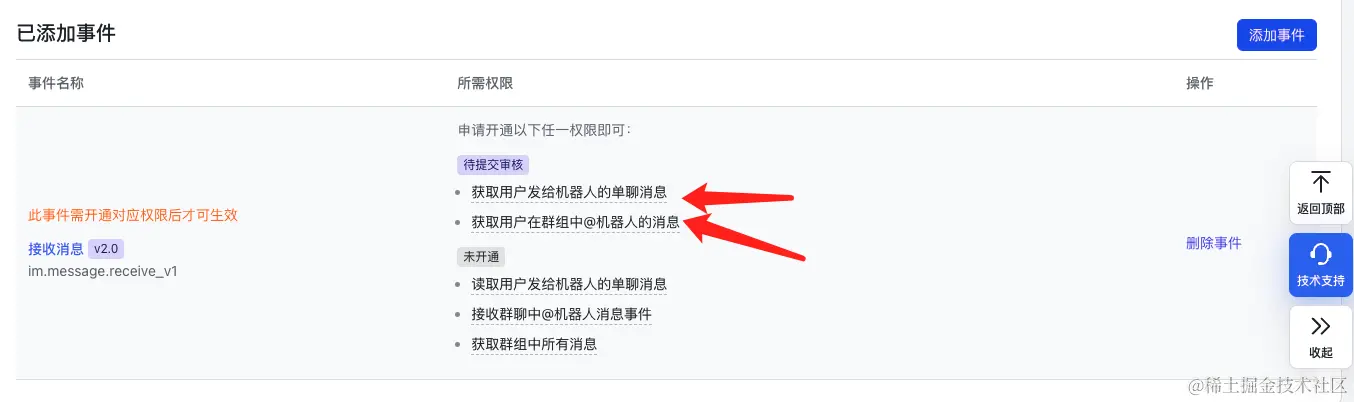 点击开启获取用户发给机器人的单聊消息和获取用户在群组中@机器人的消息权限。